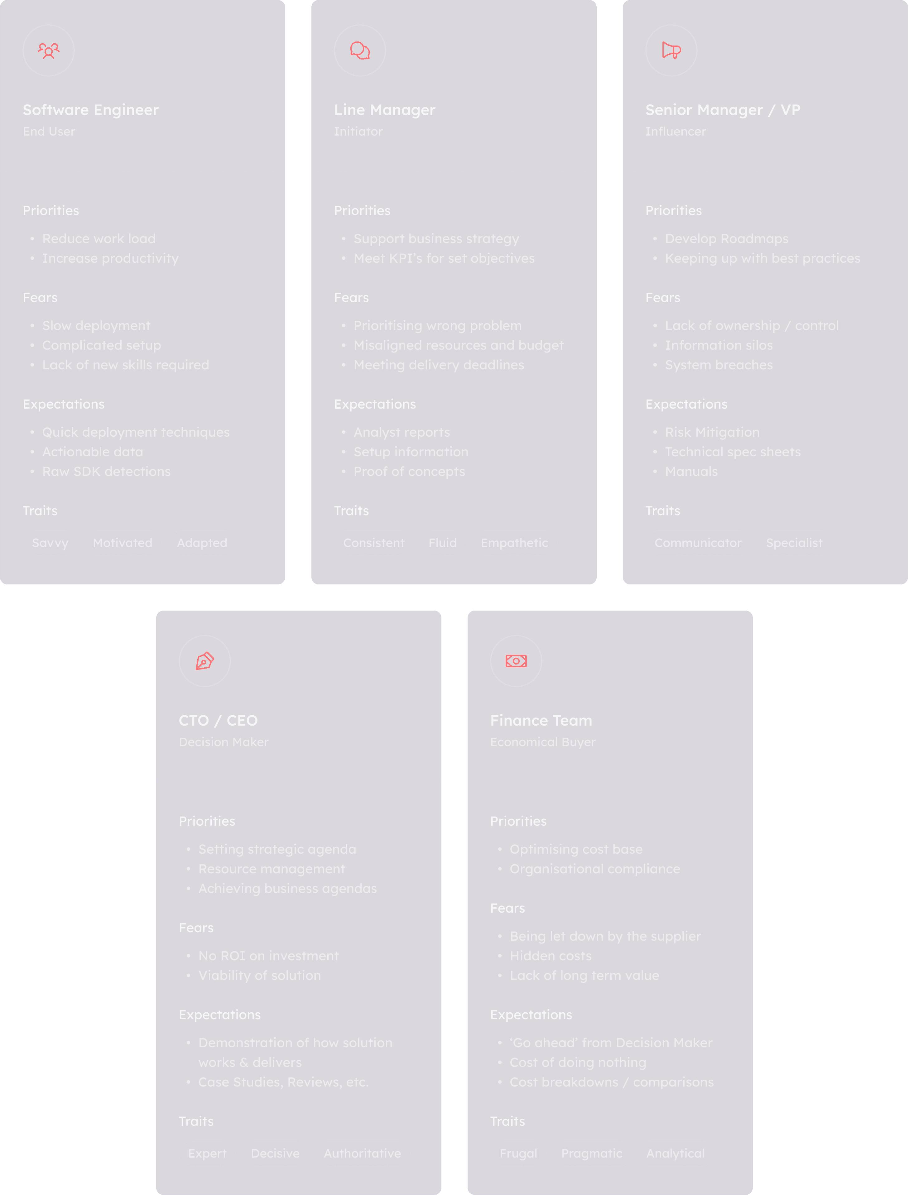 To grasp the priorities, fears, and expectations of every DMU stakeholder, we created the personas listed below. This would enable us to discern which insights would interest specific stakeholders or teams, and how these insights would benefit their product or simplify their workload.