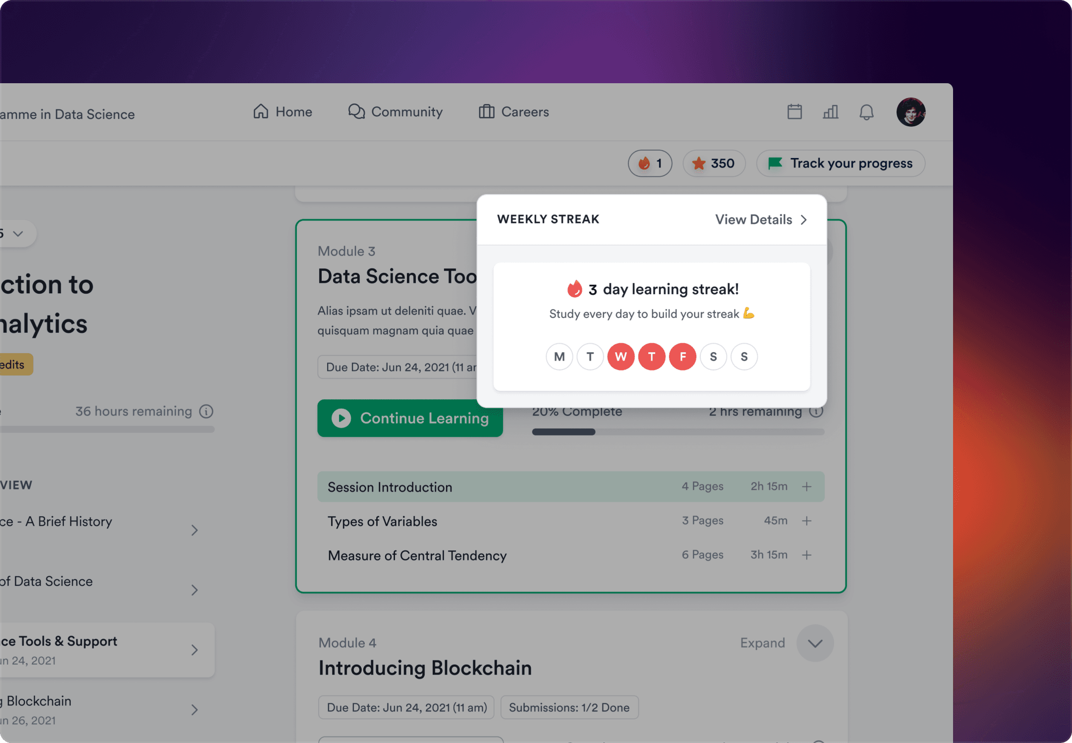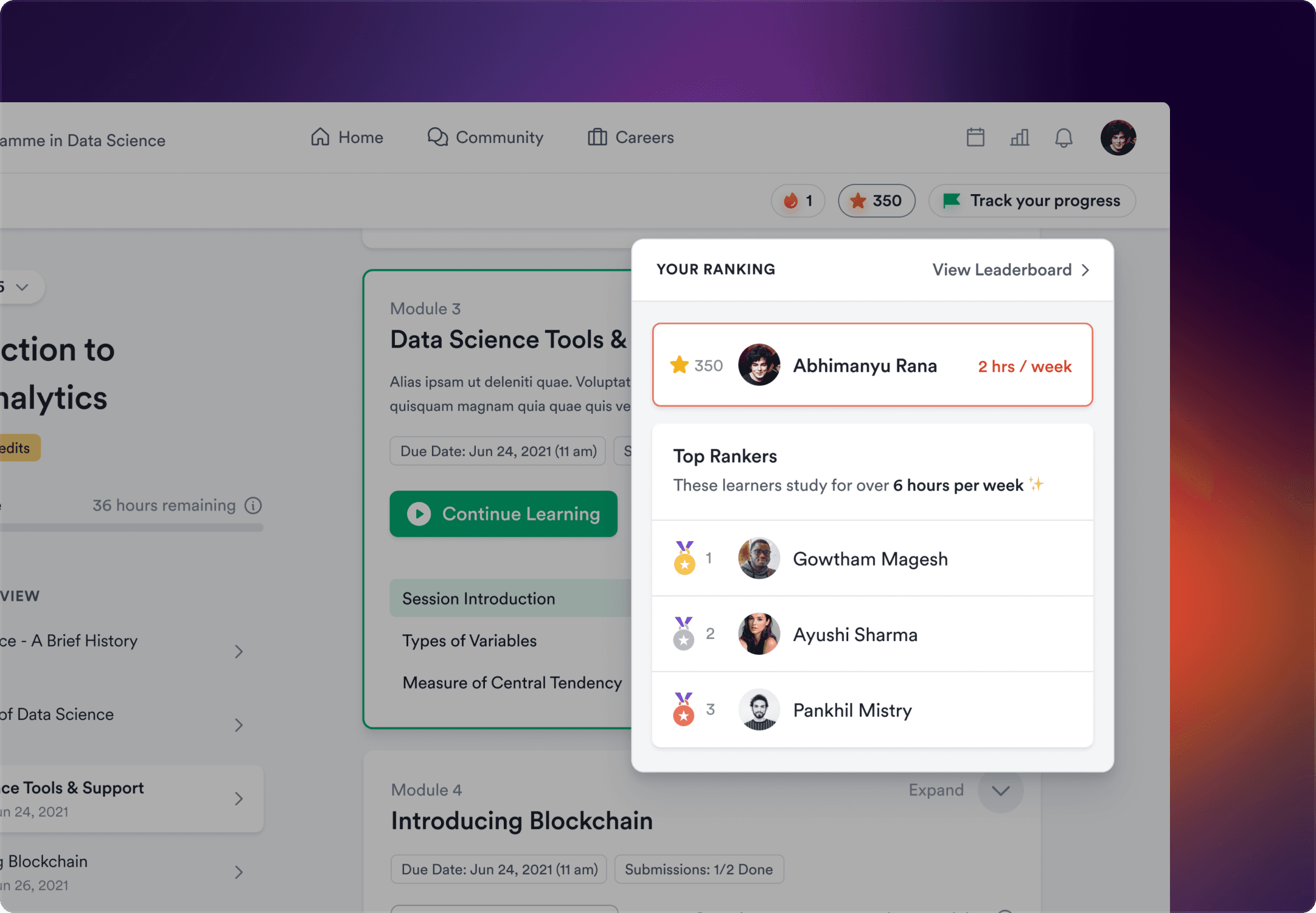 To increase stickiness and promote learner engagement, we incorporated features such as weekly streaks, peer rankings, daily goals, top performer stats, and timely nudges to prevent learners from falling behind on their course timeline.