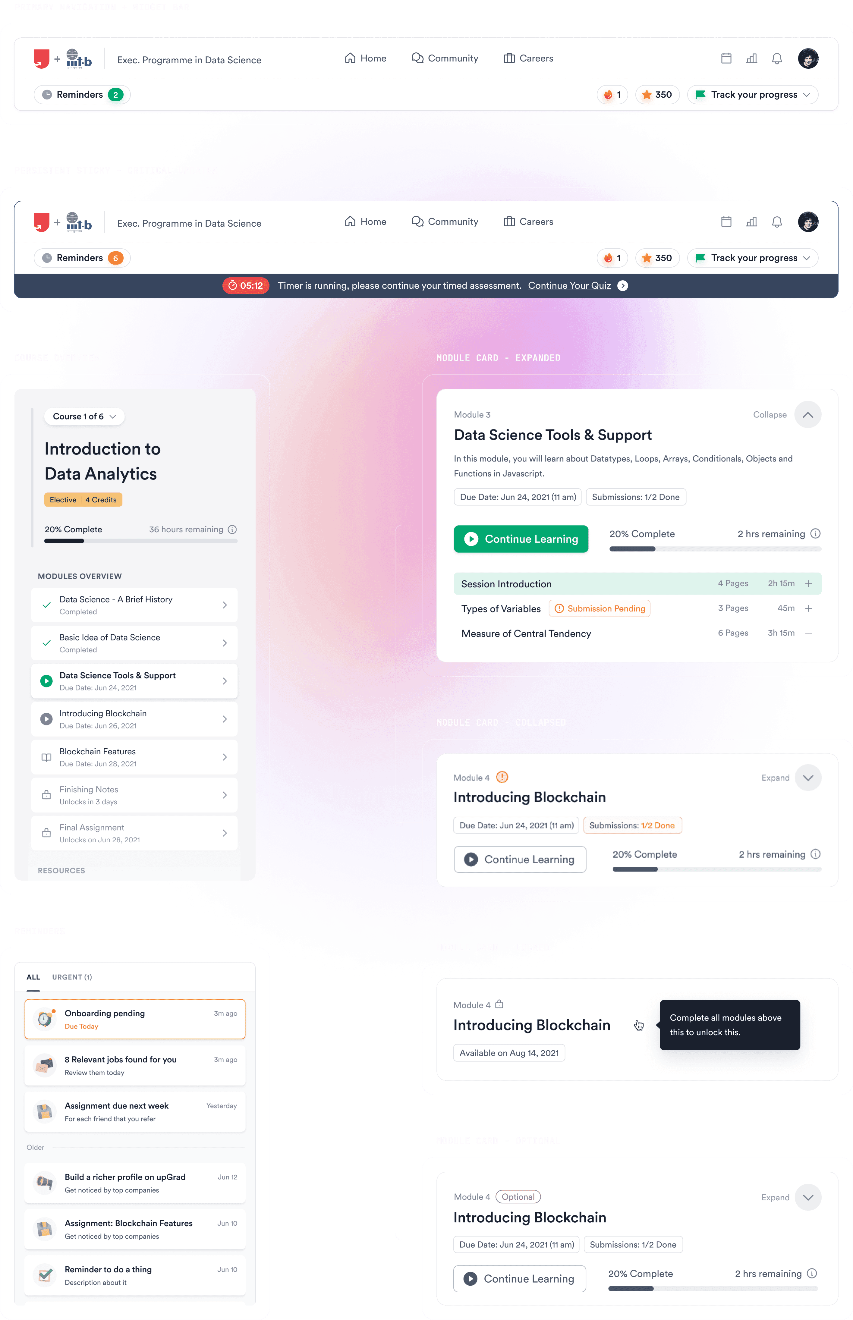 We ensured visual harmony and user-centric design by prioritizing and organizing the information into primary, secondary, and tertiary levels of importance to the user. Moreover, to assist returning learners, we added a single "pick up where you left off" button on the homepage to help them resume their learning from where they left.