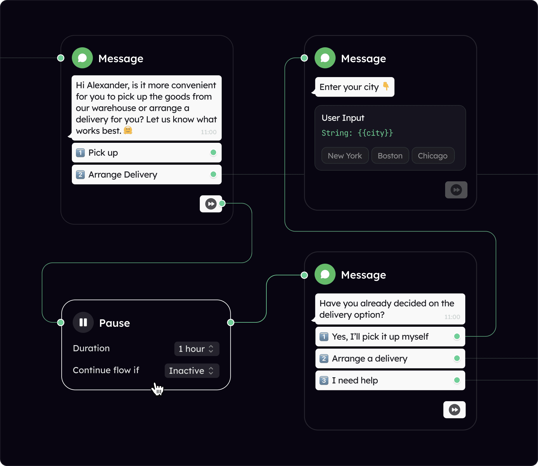 To capitalize on the strengths of chatbots, I aimed to distribute the workload accordingly, assigning actions that could be accomplished faster through the bot, while presenting the remaining tasks (primarily single-tap actions) to the user. The envisioned solution was a hybrid interface that combines a chat-based interface for queries and seamlessly integrates screens that mimic conventional apps, allowing for user interaction when necessary.
