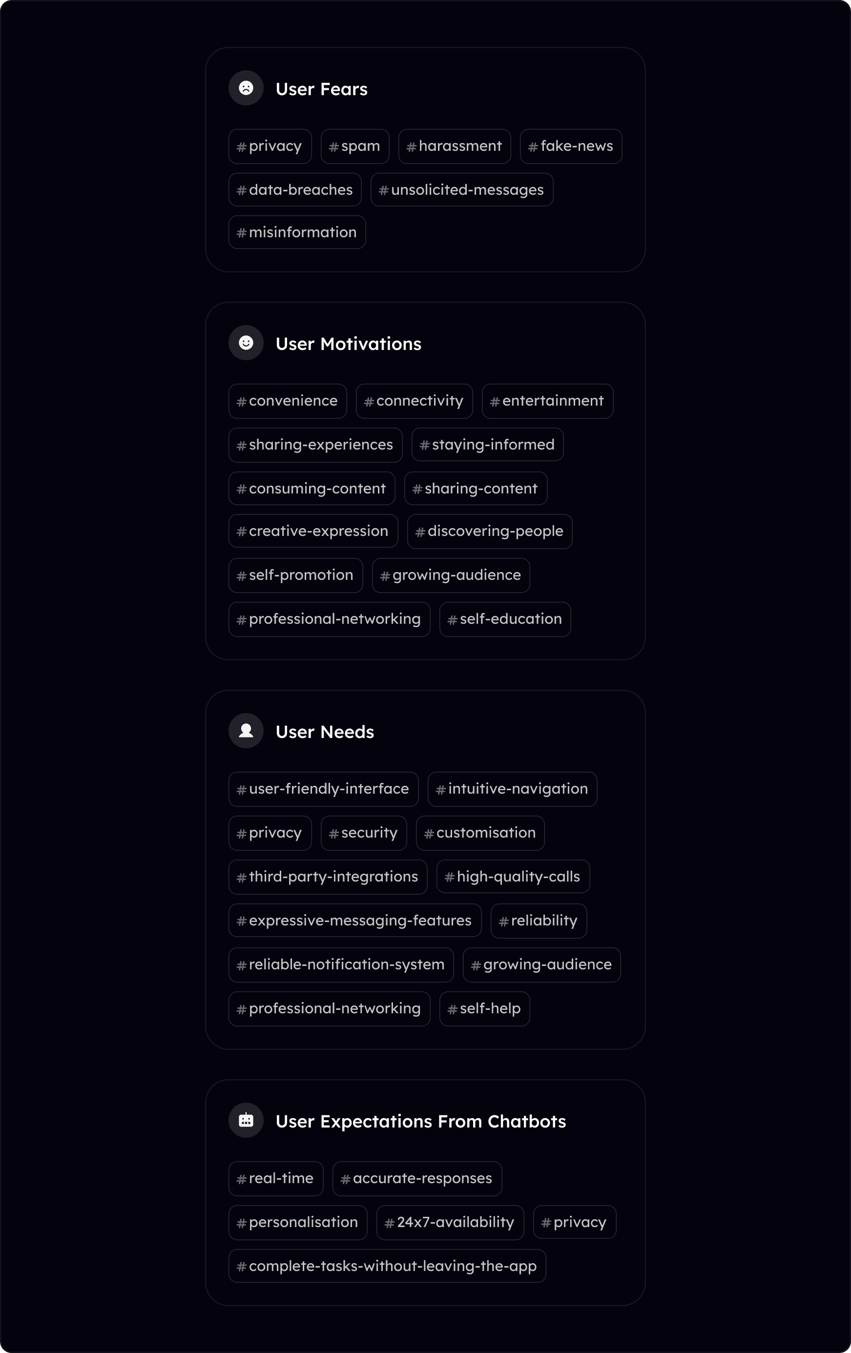 Today's users have elevated expectations for digital platforms. They anticipate seamless connectivity, personalized interactions, convenient access to information, and a sense of community. They also seek intelligent assistance, quick responses, and tailored recommendations. These insights emphasize the need for user-centric solutions across social media apps, social networks, and chatbots, ensuring enhanced experiences that foster engagement and satisfaction.