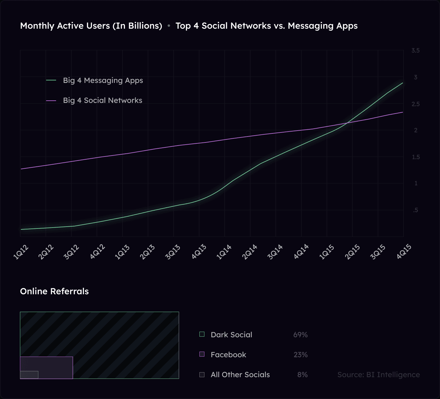 Messaging apps have surpassed social networks in terms of usage, driven by factors such as increased privacy, direct communication, real-time interactions, convenience, and content sharing without public profiles. Over 2.5 billion people had at least one messaging app installed in 2016, and this figure has risen close to 5 billion in 2022. Facebook Messenger and WhatsApp lead the market. Chat apps are now akin to the new browsers, with bots anticipated to become the new websites, ushering in a new era on the Internet.