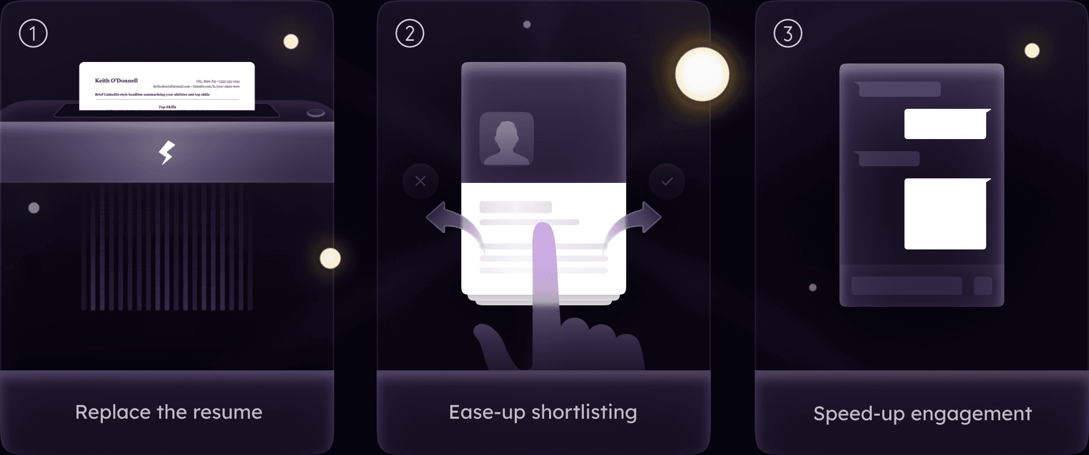 Our approach focused on mobile-first design and replacing traditional resumes with a more intuitive and compact alternative, to ease recruiters' burden of sifting through hundreds of resumes to identify the right candidate. We aimed to streamline the hiring process and simplify candidate communication for faster and more efficient hiring.