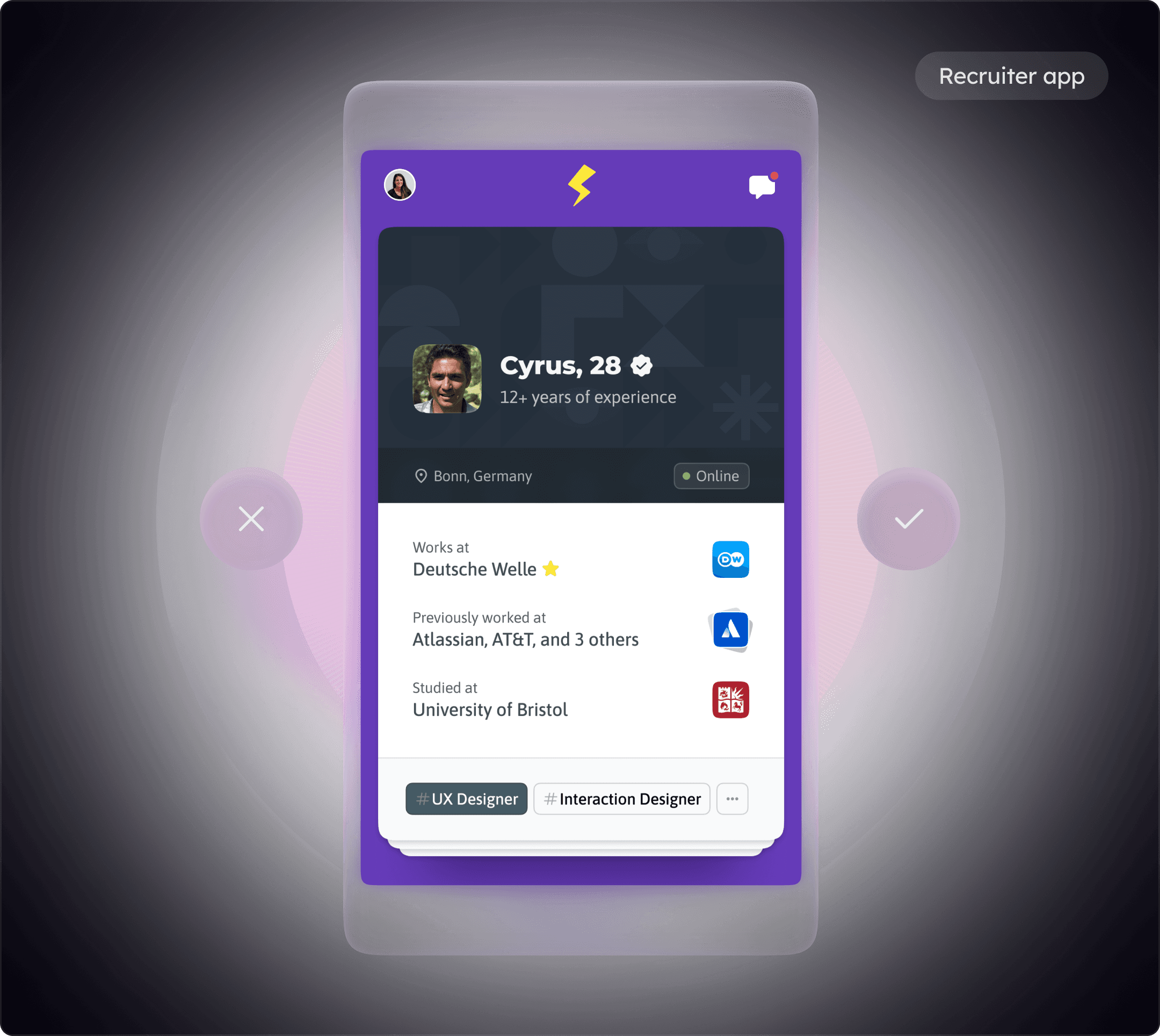 Adopting the Tinder-style, we condensed the essence of a company and the role into a compact card featuring key points for candidates to decide quickly whether to pursue it or not. The left-swiped cards went into an archive, allowing candidates to review them if they did not receive a response from the places they had applied to.