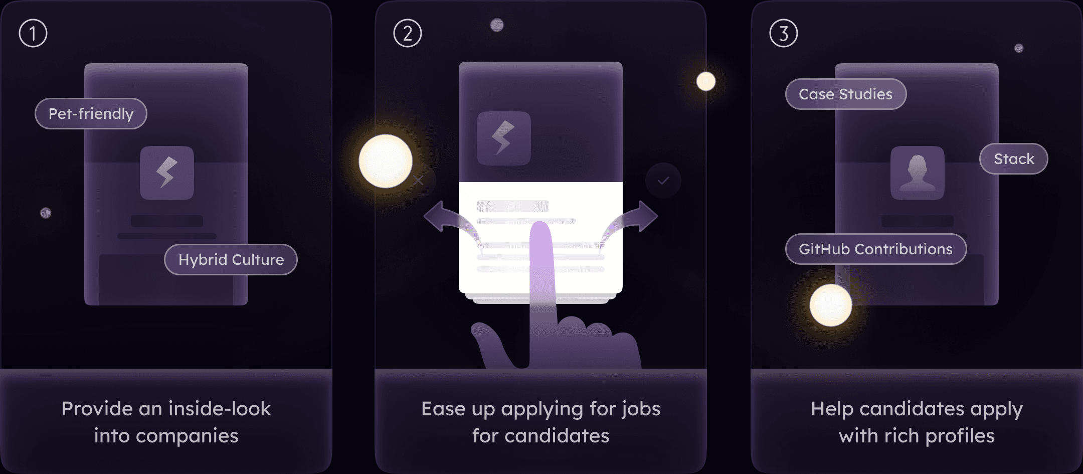We tackled job seekers' challenges by offering filters to identify jobs and companies based on culture, structure, founders, team, and benefits. We also simplified the application process by eliminating multiple forms and cover letters, and enabled candidates to create rich profiles showcasing their strengths, experience, and personality without traditional resumes.