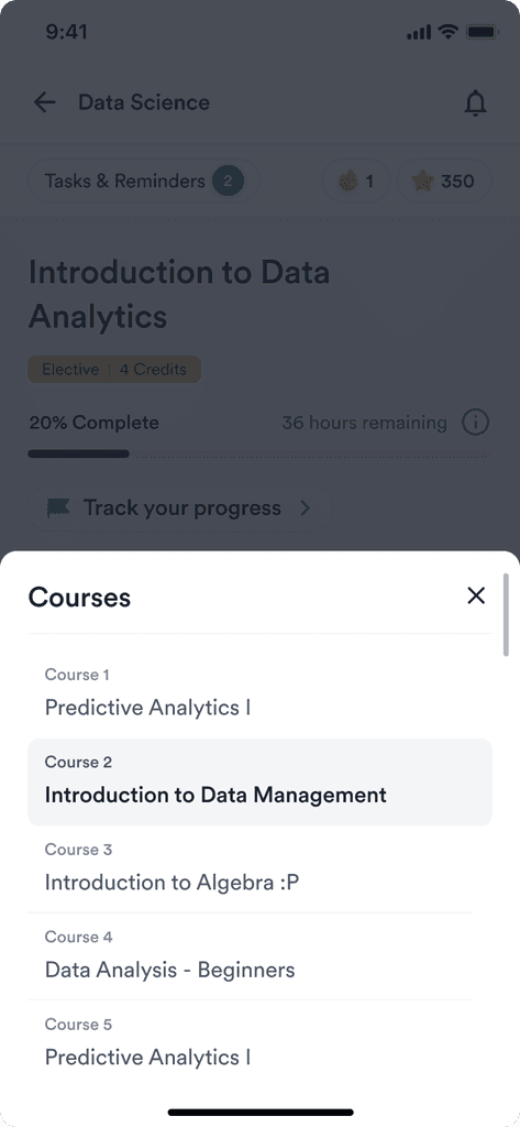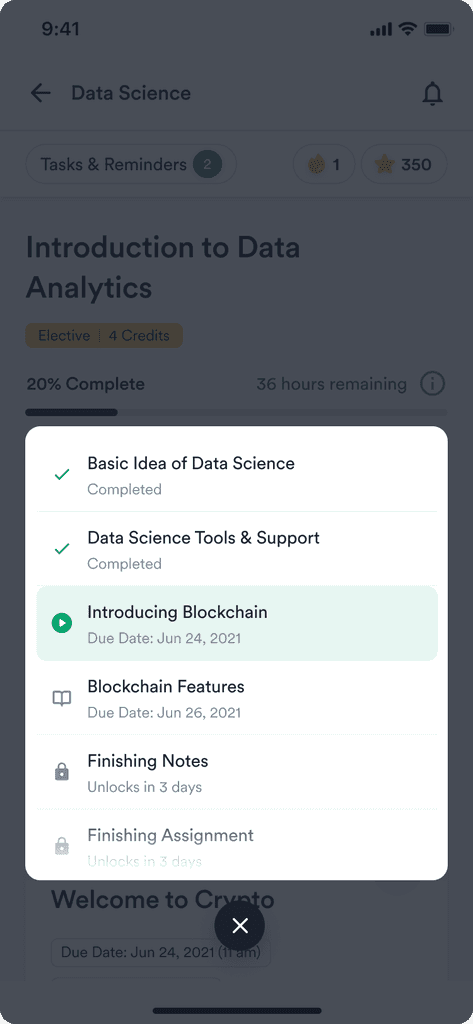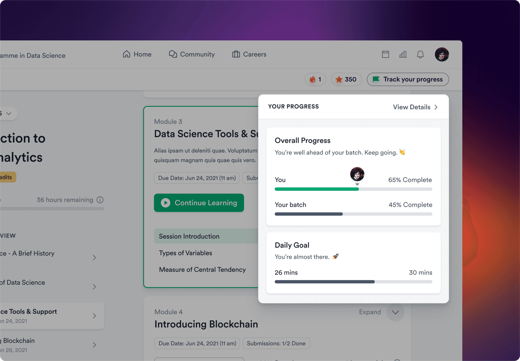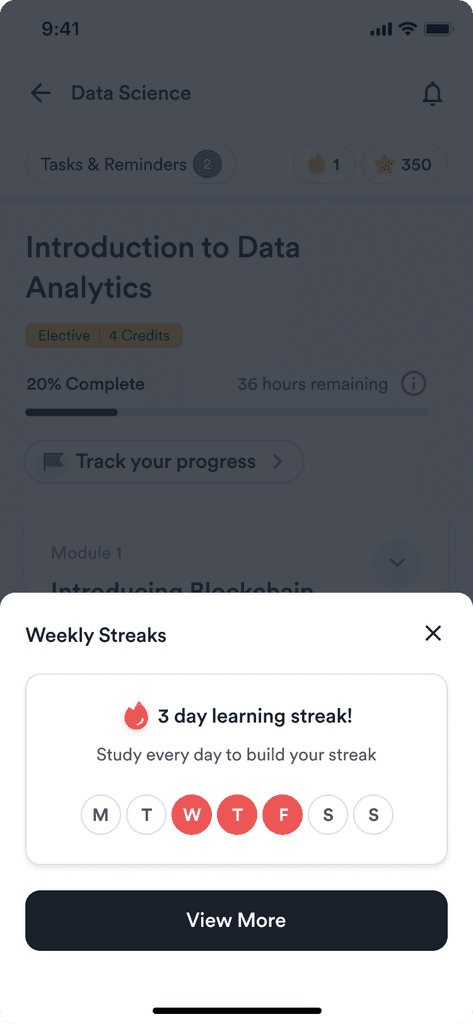 To increase stickiness and promote learner engagement, we incorporated features such as weekly streaks, peer rankings, daily goals, top performer stats, and timely nudges to prevent learners from falling behind on their course timeline.