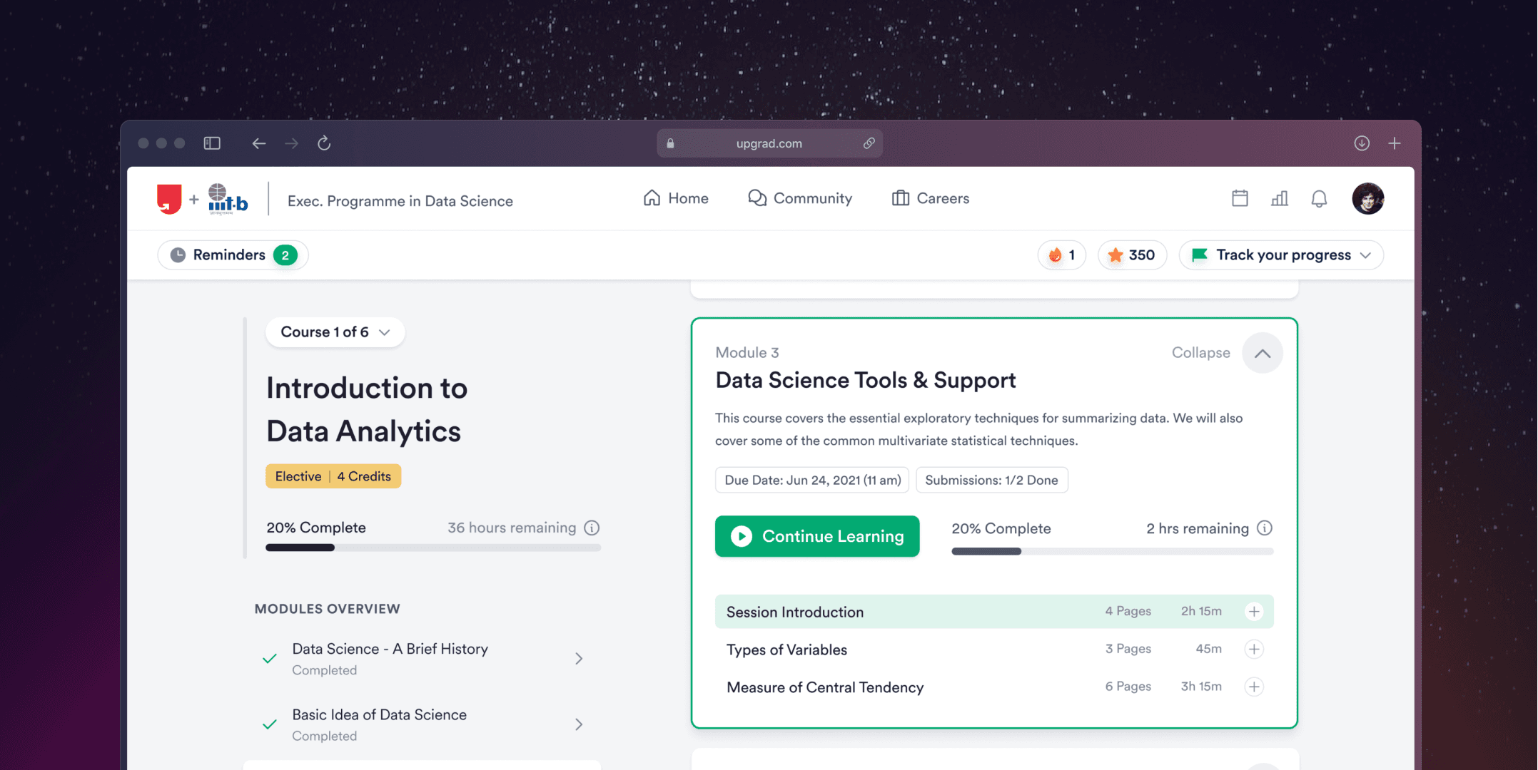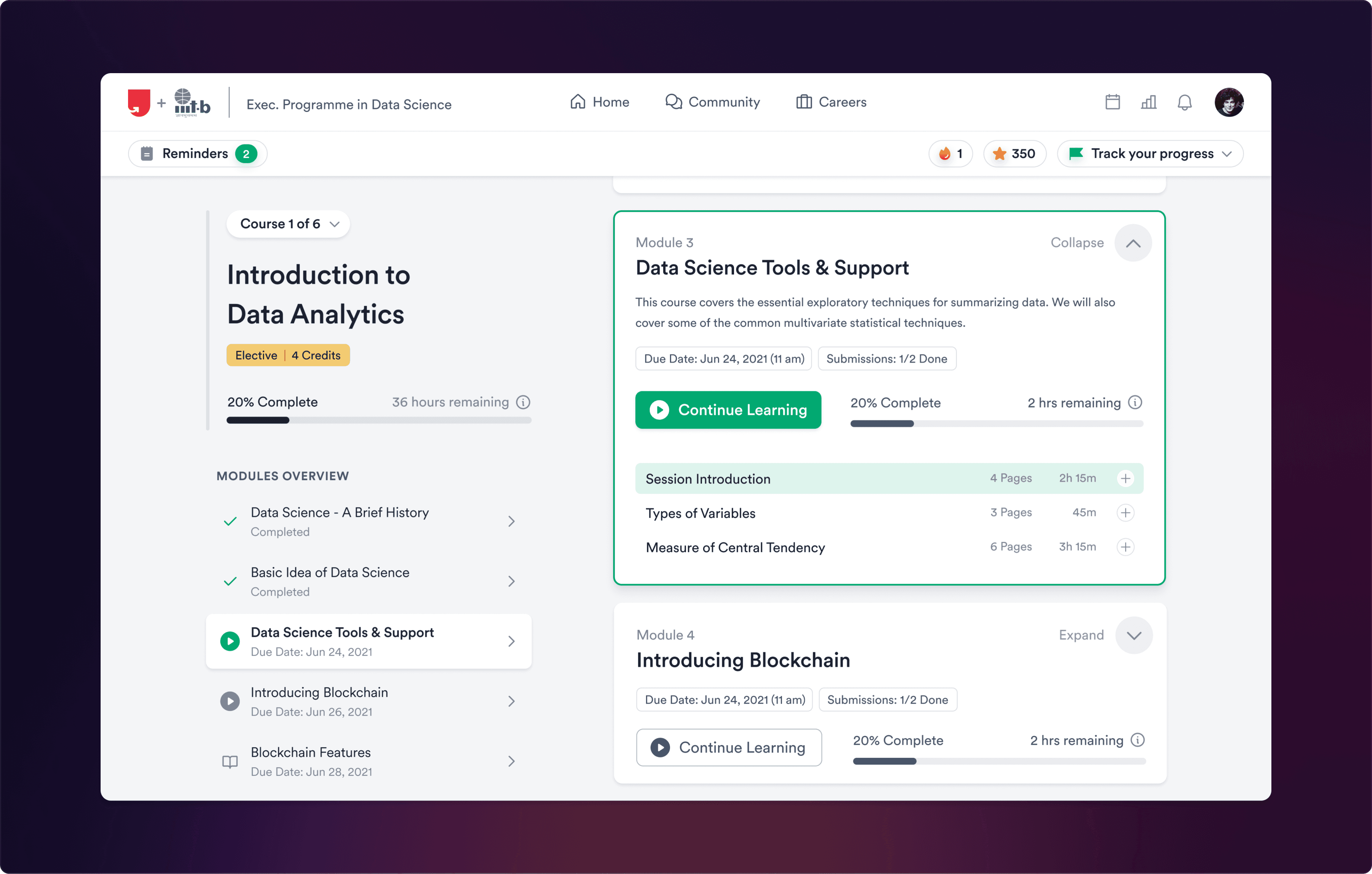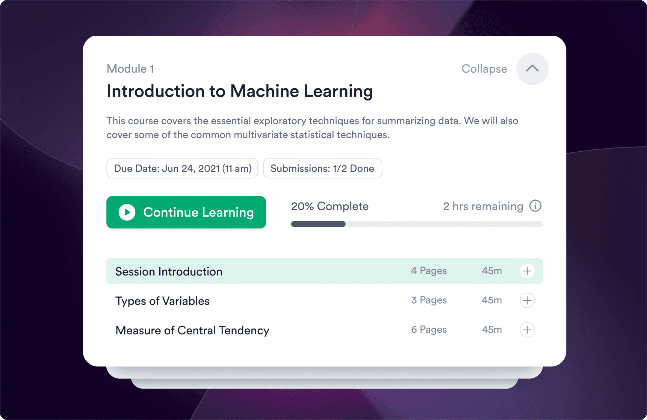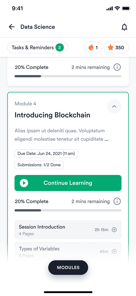 We ensured visual harmony and user-centric design by prioritizing and organizing the information into primary, secondary, and tertiary levels of importance to the user. Moreover, to assist returning learners, we added a single "pick up where you left off" button on the homepage to help them resume their learning from where they left.