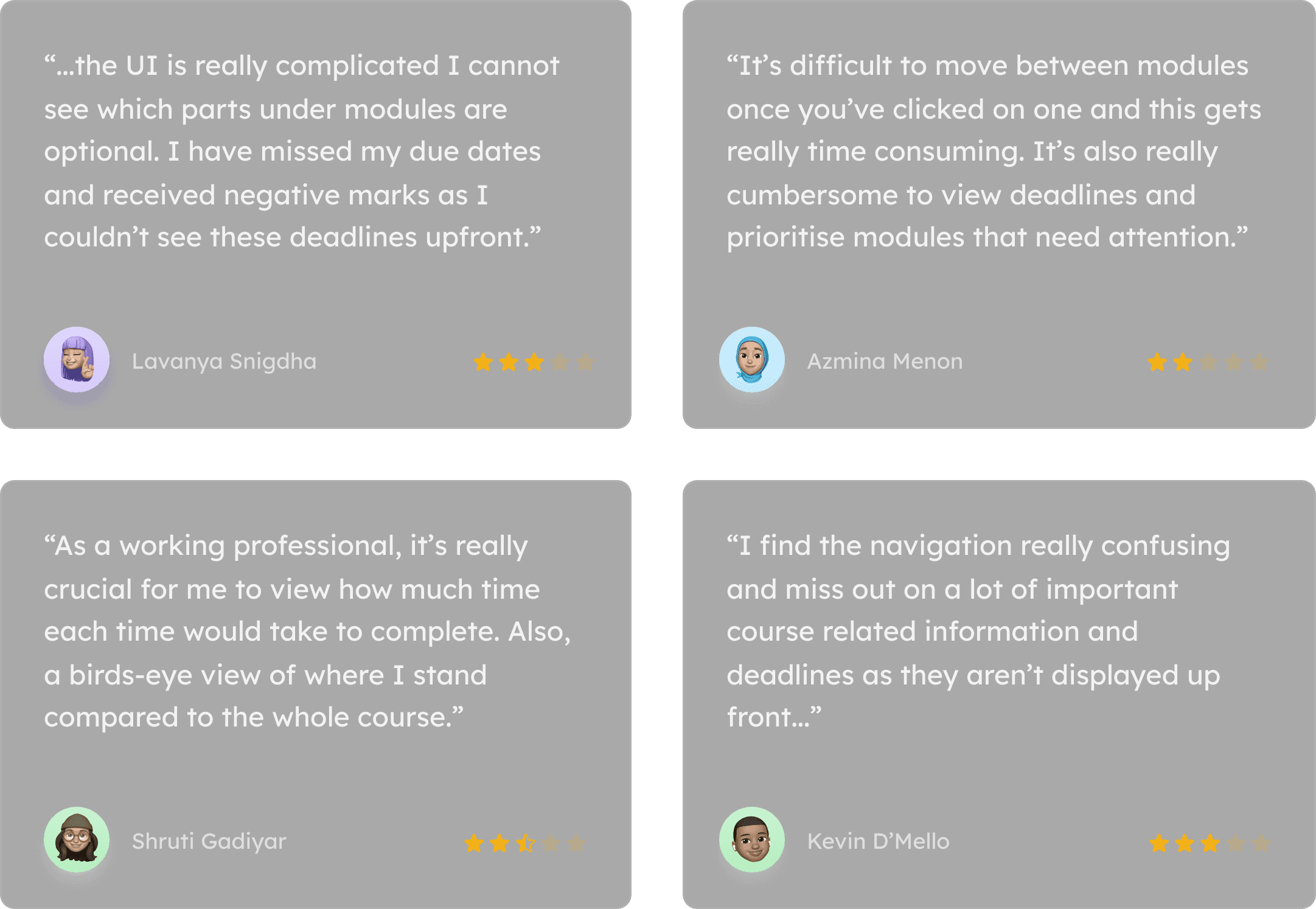 The need to address this issue was substantiated by learner feedback obtained through user interviews, surveys, and app store reviews. This feedback was further corroborated by corresponding data such as clickstreams, adoption rates, and session durations.
